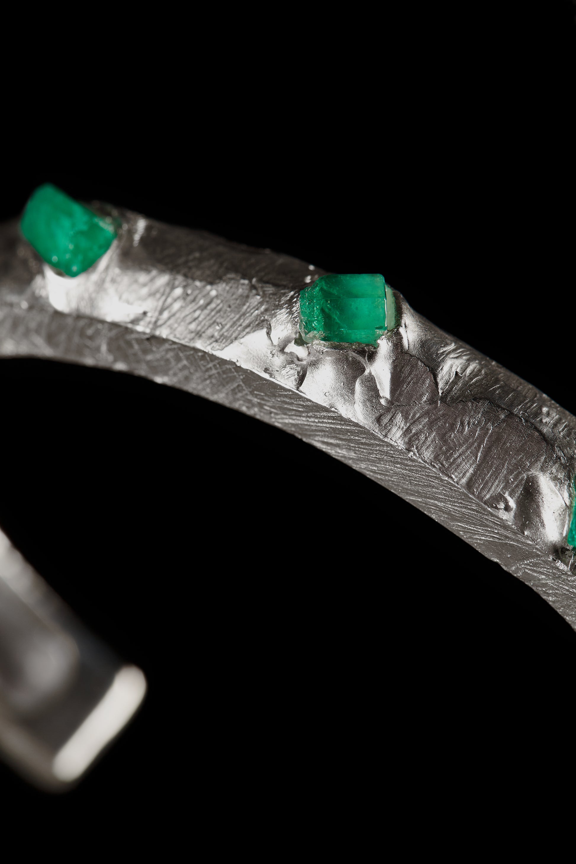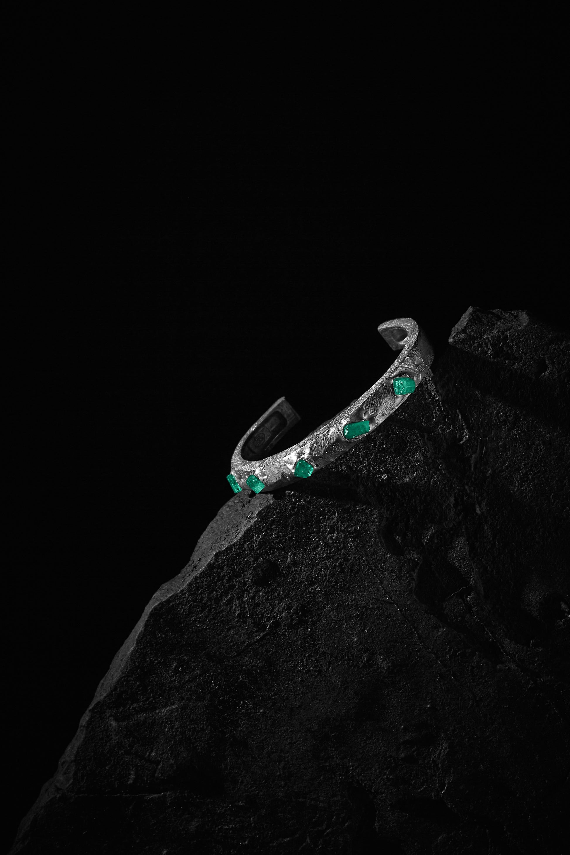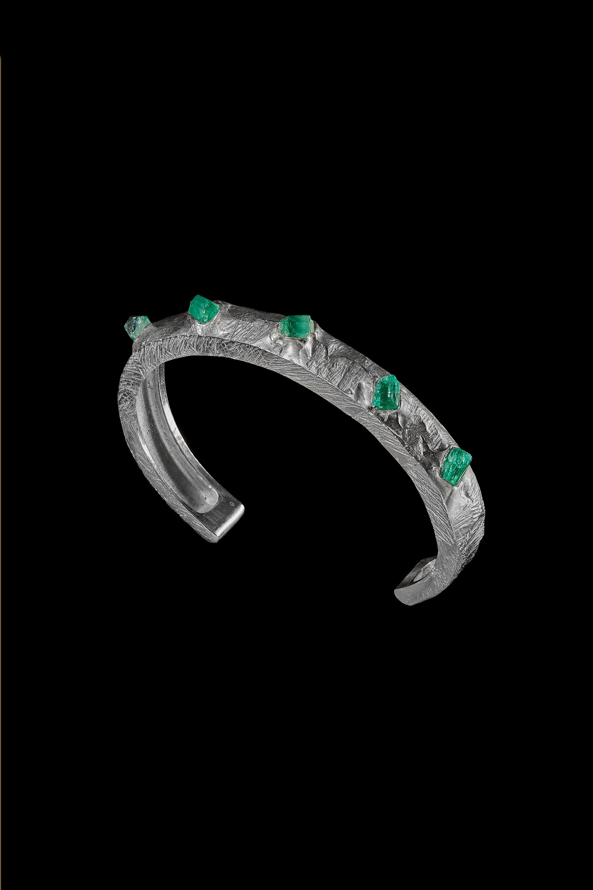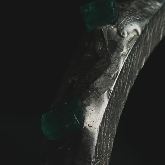 Forjada con textura natural y coronada por esmeraldas sin pulir, esta joya no solo embellece, sino que conecta con la esencia más pura de la naturaleza: el encuentro entre lo salvaje y lo precioso.