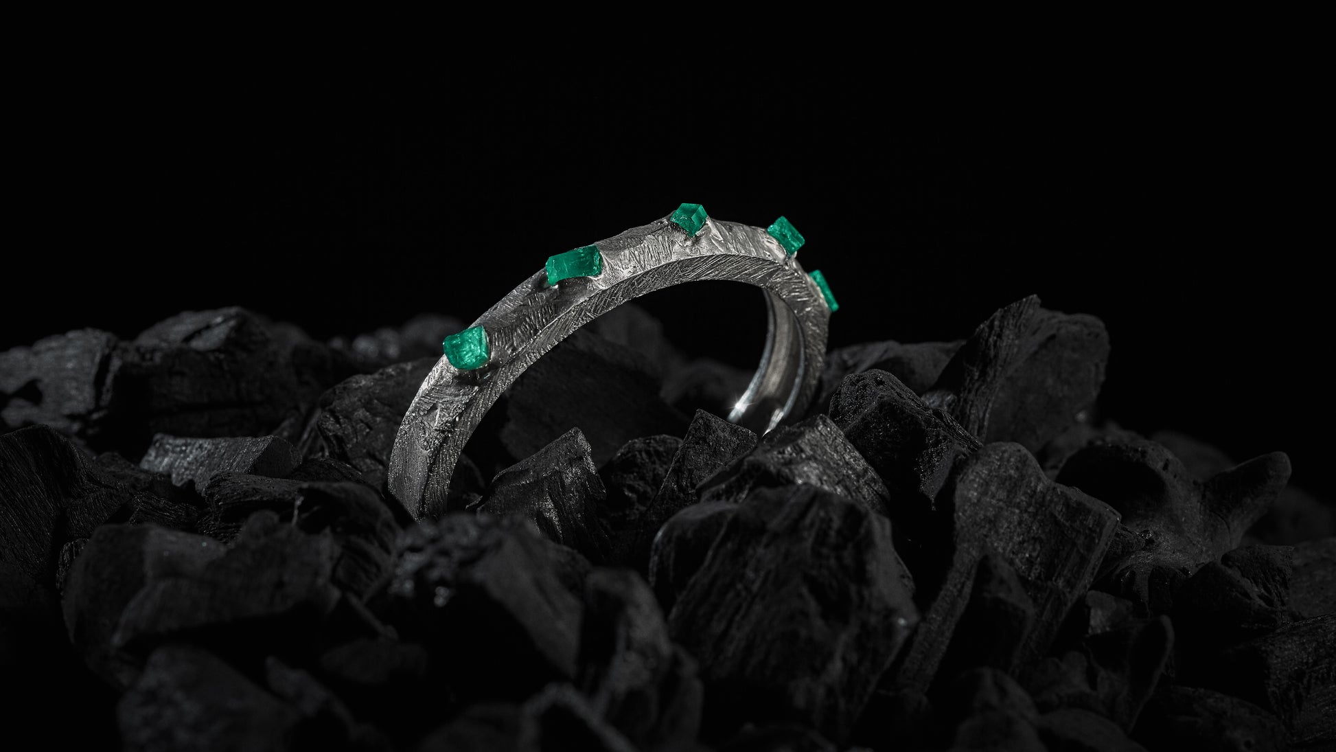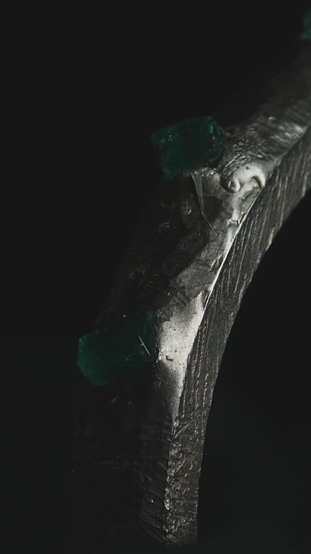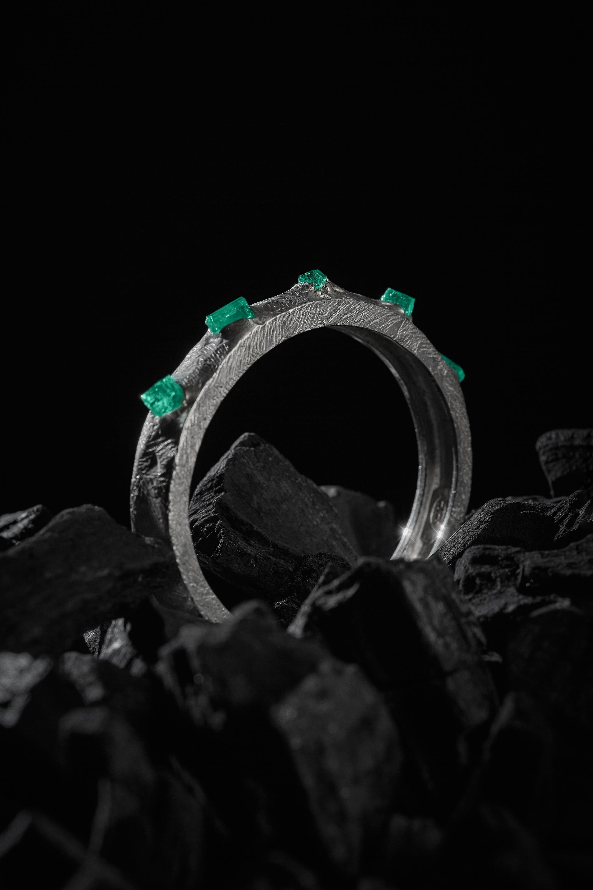 Forjada con textura natural y coronada por esmeraldas sin pulir, esta joya no solo embellece, sino que conecta con la esencia más pura de la naturaleza: el encuentro entre lo salvaje y lo precioso.