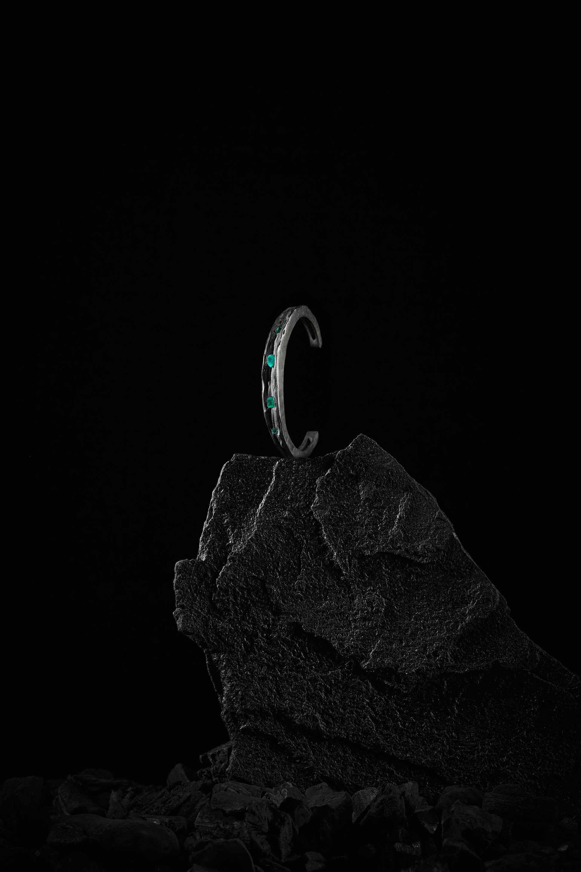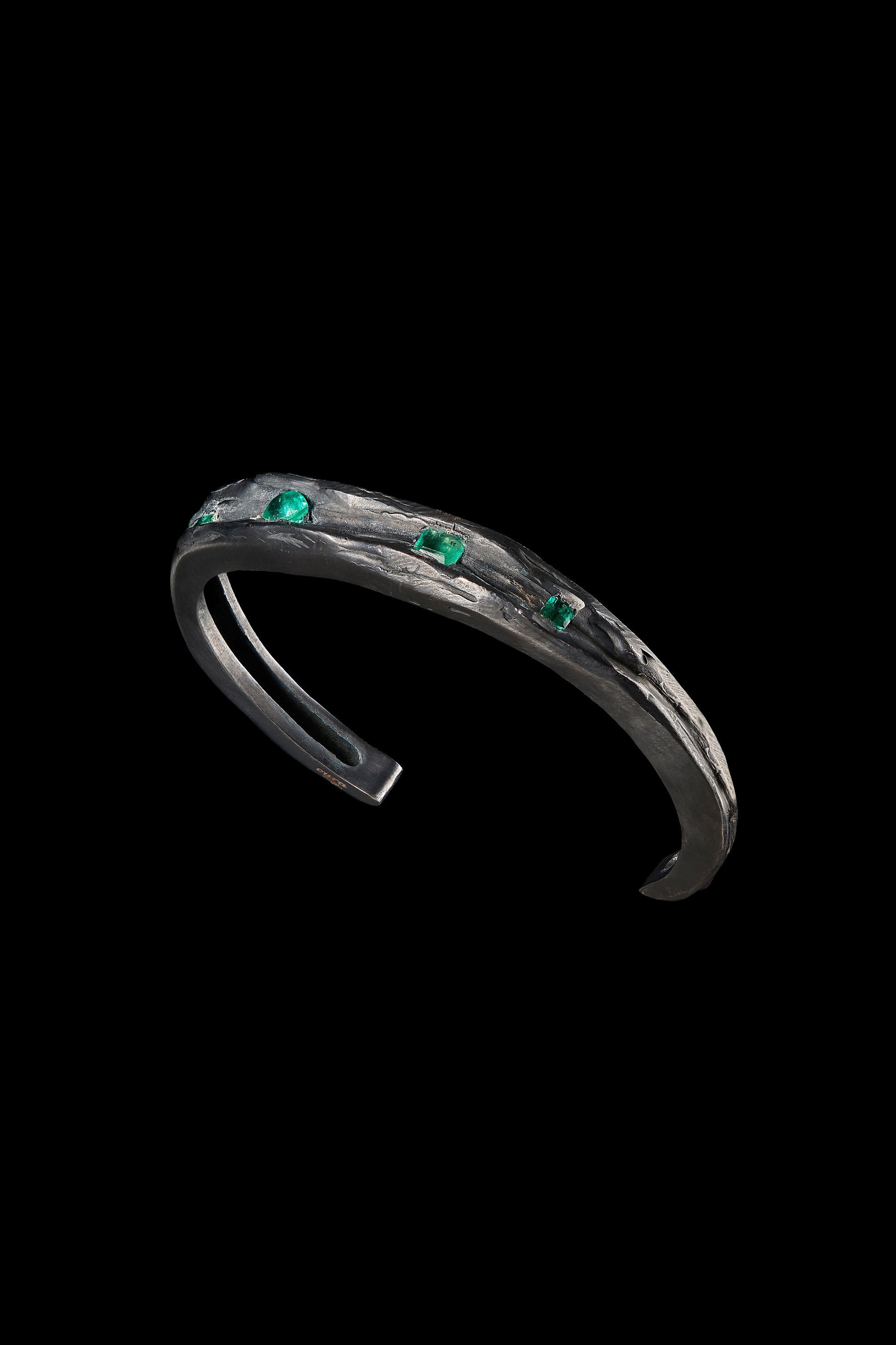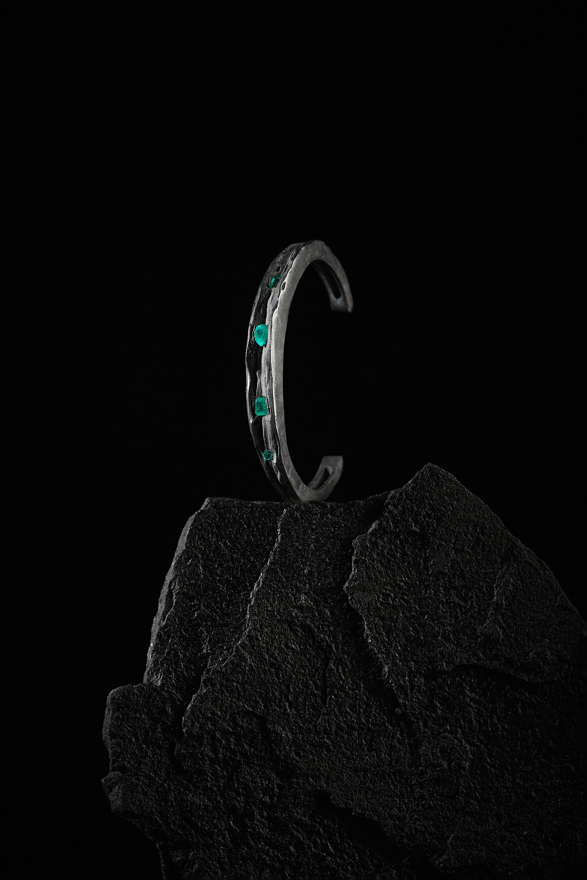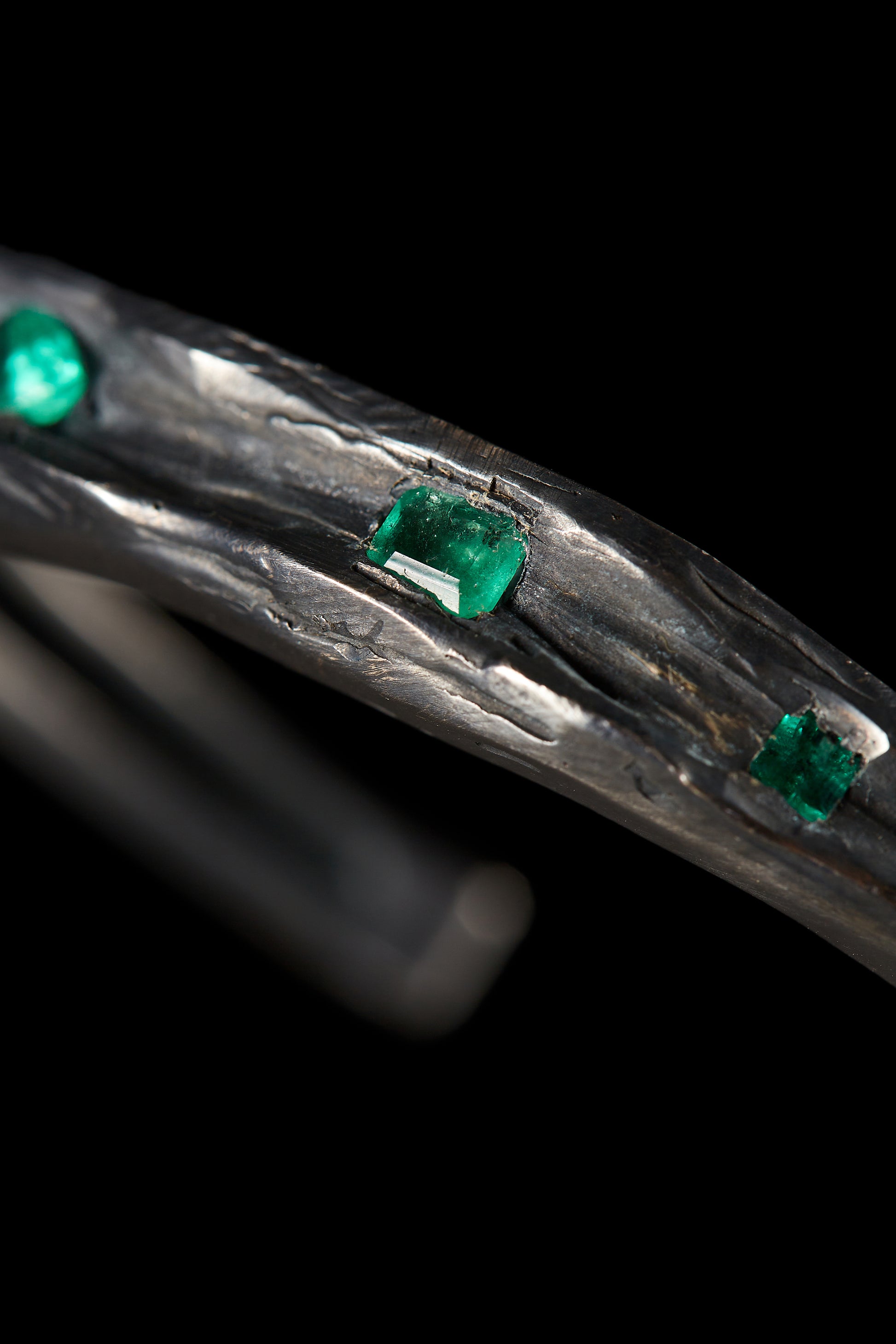 En la profundidad de la tierra, donde reina la sombra y el silencio, la plata ennegrecida se convierte en símbolo de la roca ancestral que guarda en secreto tesoros milenarios. Sobre ella, las esmeraldas pulidas emergen como destellos de claridad, recordándonos que incluso en la penumbra más densa, siempre existe un brillo que guía el camino.
